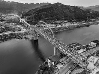 清水坪乌江特大桥位于武陵山区腹地的重庆市彭水苗族土家族自治县境内,是渝湘高铁重庆至黔江段“六隧五桥”之一和全线重难点工程。大桥全长804.6米,主跨240米,一跨过江,为国内首座双Y型单拱肋主拱结构无砟轨道高速铁路桥梁。该项目于2020年开工建设,目前已完成建设进度90%,进入最后收尾阶段。