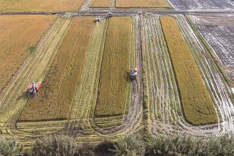 11月2日,农民驾驶农机在江苏省泰州市姜堰区张甸镇收割水稻(无人机照片)。