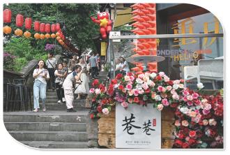 6月8日,游客在重庆市渝中区山城巷游览、拍照。