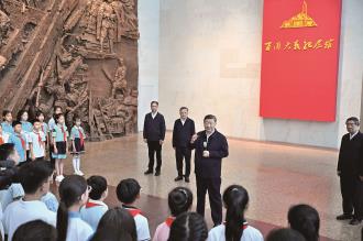 在纪念馆大厅,习近平同前来参观的青少年学生和纪念馆工作人员亲切交流。他说,88年前的今天发生的“七七事变”,是中华民族全面抗击日本侵略者的起点,前事不忘、后事之师,到这里来就是接受精神洗礼。广大青少年生逢其时,要赓续红色血脉,树立强国有我的远大志向,做堂堂正正、光荣自豪的中国人,勇担民族复兴的时代大任。
