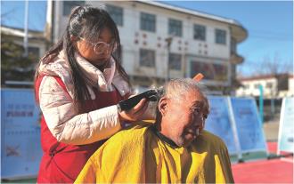 “参与活动就是想献出自己的一份爱,村里的中老年人出门理发不方便,能为他们尽点力,我心里也踏实。”叶蓉一边说,一边细心地为老人扫去肩上的碎发。