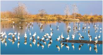1月11日,鸟儿在江苏兴化里下河国家湿地公园内栖息、觅食(无人机照片)。